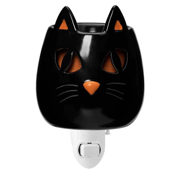 Calling all you witches (and wizards!), Scentsy has released the Spooky Stare Mini Scentsy Warmer with wall plug as part of its Harvest & Halloween Collection, and if you love black cats, you are going to adore this limited edition wax warmer! It features a cat’s head in black ceramic, with pointed ears, a cute button nose, and glow-in-the-dark eyes for good measure.