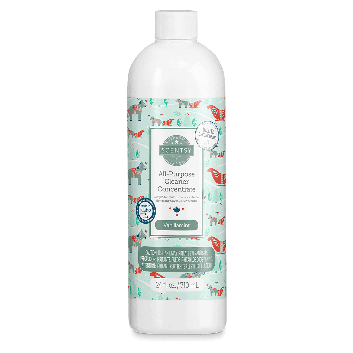You can use Vanillamint Scentsy All-Purpose Concentrate Cleaner on walls, floors, kitchen counters, and non-porous bathroom surfaces to fragrance your home with notes of wintergreen frost, smooth vanilla, and frozen citrus. A seasonal sensation that the whole family will adore. A single bottle makes six 16oz bottles of multipurpose cleaner – enough to clean and scent your home for months!