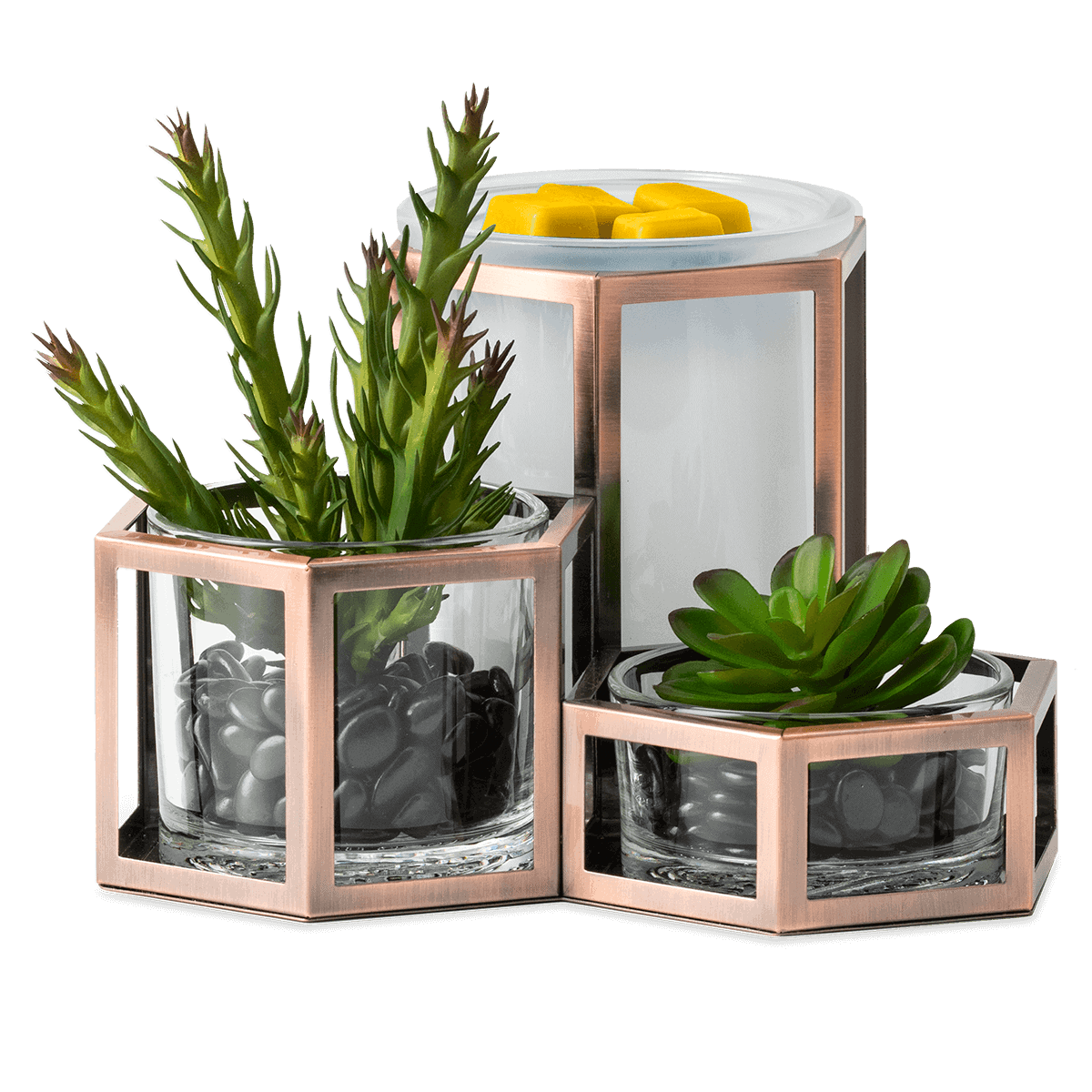 The Wild Desert Scentsy Warmer includes three hexagonal pieces linked together to create the perfect display. Stylish metal detailing gives it a modern and trendy feel, while faux desert succulents promise to bring a touch of the wild west to any desktop, bathroom, or family living space. A gorgeous glass wax tray adds the finishing touch to this limited edition Scentsy Warmer. Grab yours today!